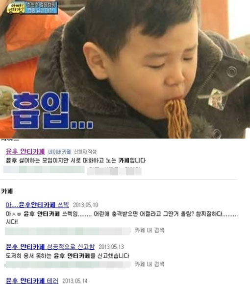 해당 글을 쓴 누리꾼은 “윤후도 안티카페가 생겼다. 그런데 비공개다. 역시 떳떳하지 못한 사람들... 애들 안티해서 뭐해”라고 전했다.