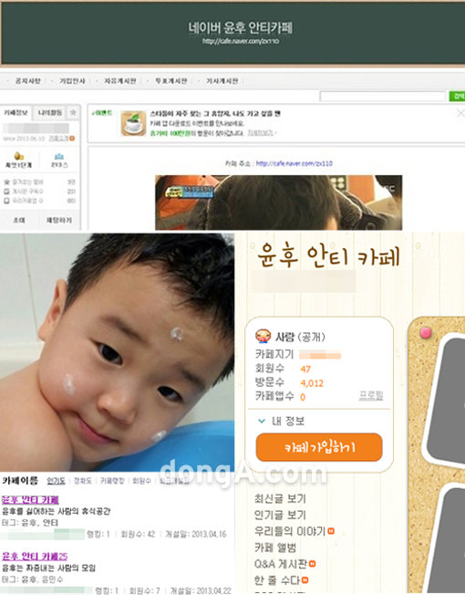 그런데 한 포털사이트에만 개설된 줄 알았던 ‘윤후 안티카페’가 다른 포털 사이트에도 버젓이 운영 중인 것으로 확인됐다. 이 포털사이트에는 두 곳이나 운영 중이며, 각각 지난 4월 중순에 개설됐다.
