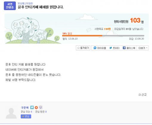 ‘윤후 안티카페’에 화난 일부 누리꾼들 사이에서 서명운동도 일었다.
