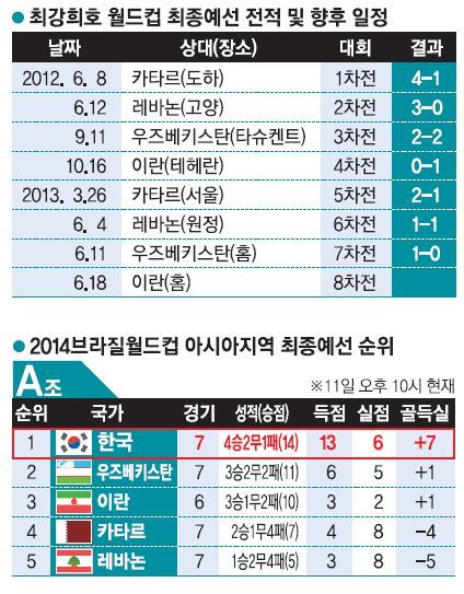 최강희호가 2014브라질월드컵 최종예선 단 1경기만을 남겨놓고 있다. 18일 울산문수경기장에서 ‘맞수’ 이란과 상대한다. 이란과 역대전적은 9승7무10패. 특히 작년 10월 이란과 최종예선 4차전 원정에서 0-1로 졌다. 1명이 퇴장당한 수적 우세를 딛지 못하고 후반 27분 네쿠남에게 결승골을 헌납하며 무너졌다. 2승1무로 승승장구하던 한국은 첫 패를 당하며 이란에 골득실차에서 앞선 조 1위를 아슬아슬하게 유지한 바 있다. 선수들은 이란과 최종전에서 설욕을 벼르고 있다. 이란을 격파하고 조 선두로 월드컵 본선을 확정짓겠다는 각오다. 승리해야 하는 이유는 또 있다. 최강희 감독의 대표팀 고별전이기도 하다. 그동안 부진했던 대표팀의 경기력 논란을 털고 아시아 맹주 자리도 회복해야 한다. 대표팀은 파주국가대표트레이닝센터(파주NFC)에서 훈련을 가진 뒤 15일 비행편을 이용해 울산으로 내려간다.