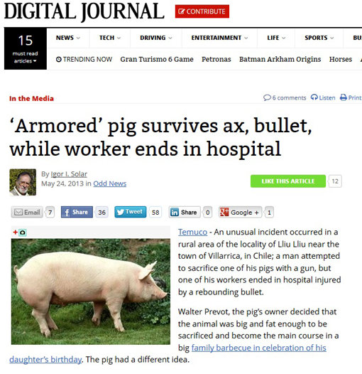 캐나다의 디지털저널닷컴은 지난 달 24일 이마로 총알을 튕겨낸 돼지 이야기를 보도했다.