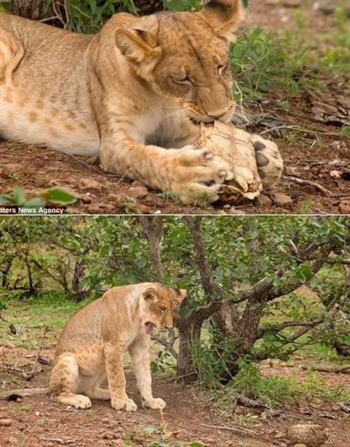 사진을 보면 어린 사자 한 마리가 거북이를 먹어보려고 안간힘을 쓰는 모습이 역력하다. 이 사자는 딱딱한 거북이 등껍질 때문에 결국 먹기를 포기한다.