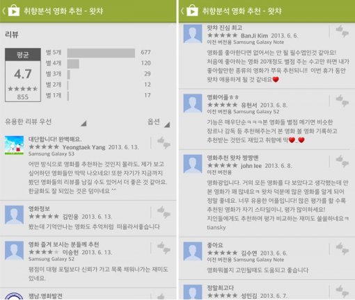 사용자들의 반응은 뜨겁다. 애플 앱스토어와 구글 플레이스토어에 등록된 사용자 리뷰를 보면 ‘영화 추천 앱이 필요했는데 정말 좋다’, ‘이런 서비스를 기다려 왔다. 만족한다’라는 이야기가 많다. 최근에는 ‘왓챠로 영화 별점을 매기는 게 너무 재미있어서 시험 공부를 못 하겠다. 공부를 해야 하니 탈퇴하게 해 달라. 시험을 치르고 나서 다시 가입하겠다’는 메일까지 왔다고 한다. 왓챠의 사용자는 6월 12일을 기준으로 약 19만 명이다.