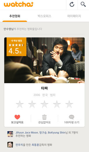 여러 서비스 중 최근에는 사용자가 원하는 영화를 추천해주는 서비스인 ‘왓챠(Watcha!)’가 주목을 끌고 있다. 왓챠는 사용자의 취향을 분석해 영화를 추천해주는 서비스다. 이전에 본 영화에 별점을 매기면 왓챠가 취향을 분석해 재미있게 볼 만한 영화를 소개한다. 정식 서비스가 나온 지는 얼마 되지 않았지만 사용자들의 반응이 뜨겁다.