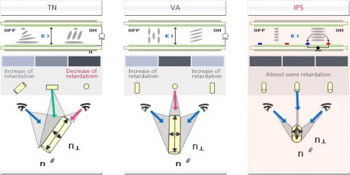 그런데 TN 방식은 디스플레이로서 몇 가지 단점이 있었다. 우선 액정 분자 배열이 시야각과 일치하지 않으면 화면이 잘 보이지 않으며, 화면을 보는 각도에 따라 회색 반전(화면의 명암이 반대로 보이는 현상)이 나타난다. 또한, 빠른 동영상에서 잔상이 남기도 했다. 이런 TN 방식의 시야각 문제를 개선하기 위해 90년대 중반 모니터용 대형 패널을 중심으로 여러 기술이 제안됐는데, 그 대표적 기술이 VA와 IPS다.