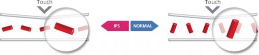 이와 달리 IPS(In Plane Switching) 방식은 액정 분자를 수평으로 배열해 이를 제자리에서 회전시키며 화면을 표시하는 방식이다. VA 방식보다 시야각이 좀 더 넓고, 색 표현력이 높다. TN 방식보다 응답속도가 느리지만 VA 방식보다는 상대적으로 빨라 동영상 등을 볼 때 유리하다. 뿐만 아니라 주변이 밝은 야외에서 사용해도 화면이 선명하게 보인다. 또한, VA 방식보다 액정 분자가 안정적인 형태로 배열돼 압력이 가해져도 구조가 흐트러지지 않는다. 즉 스마트폰이나 태블릿PC 등의 터치 스크린에 사용하기 좋다.