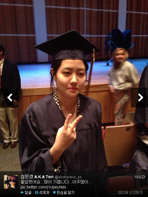 심은경은 14일 자신의 트위터를 통해 졸업사진을 게재했다. 사진 속 그는 학사모와 졸업가운을 입을 채 손으로 '브이(V)'자를 만들고 있다. 그는 사진에 "졸업했어요… 많이 기쁩니다… 아주 많이…"라는 말을 덧붙여 기쁨을 표현했다.
