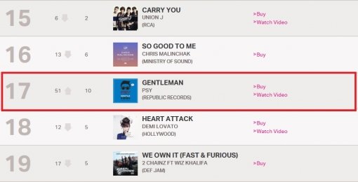 한편 싸이의 ‘젠틀맨’은 최근 영국 오피셜차트컴퍼니가 발표한 싱글 차트에서 지난주 51위 보다 무려 34계단 상승한 17위를 기록했다.