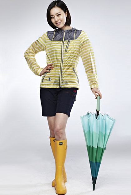 프랑스 명품 수제 레인부츠 ‘르샤모 아이리스’를 신고 있는 밀레 모델 문채원. 아웃도어 비수기인 장마철이 시작되면서 아웃도어 브랜드들이 레인코트, 부츠 등 다양한 레인용품을 출시하고 고객잡기에 나서고 있다. 사진제공|밀레