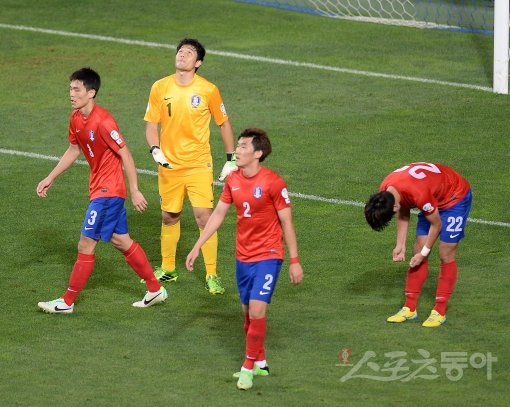2014 브라질월드컵 아시아지역 최종예선 A조 최종예선 8차전 한국 대 이란 경기가 18일 울산문수월드컵경기장에서 열렸다. 후반전 이란 레자 구찬네자드에게 선제골을 허용한 한국 정성룡이 하늘을 바라보고 있다.