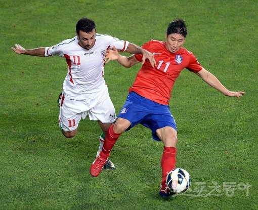 2014 브라질월드컵 아시아지역 최종예선 A조 최종예선 8차전 한국 대 이란 경기가 18일 울산문수월드컵경기장에서 열렸다. 후반전 한국 이근호와 이란 골람 레자 레자에이와 볼다툼을 벌이고 있다.