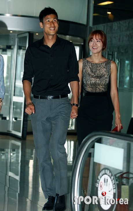 축구선수 구자철(24, 아우크스부르크)이 22일 오후 서울 광진구 광장동 세라톤 워커힐호텔 비스타홀에서 결혼식을 올린다. 하객으로 참석한 정조국, 김성은 부부가 식장으로 들어오고 있다.