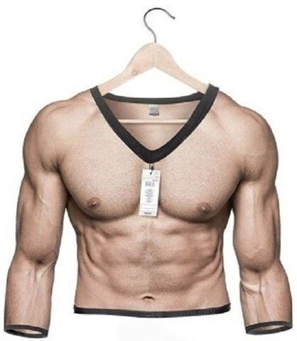 공개된 ‘벗을 수 없는 몸짱’ 사진에는 옷걸이에 걸린 근육이 실감 나게 프린트된 티셔츠의 모습이 담겨있다. 어떤 남성이든 이 티셔츠 하나만 입으면 몸짱으로 보일 수 있도록 근육질 몸매로 변신할 수 있을 것 같다.