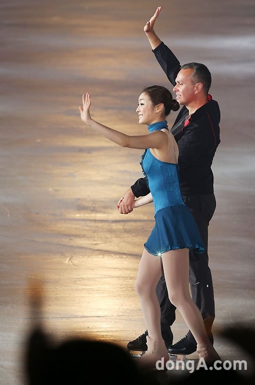 ‘피겨여왕’ 김연아와 윌슨 코치가 22일 오후 서울 송파구 올림픽공원 내 체조경기장에서 열린 ‘삼성 갤럭시 스마트에어컨 올댓스케이트 2013’에서 화려한 무대를 선보인 후 관중에게 인사를 하고 있다.