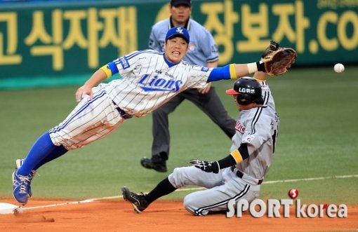 23일 오후 대구 시민구장에서 열린 ‘2013 한국야쿠르트 세븐 프로야구’ 삼성 라이온즈와 LG 트윈스의 경기 LG 6회초 무사 2루에서 삼성 차우찬의 폭투 때 2루주자 정성훈이 3루로 뛰고 있다. 정성훈은 삼성 포수진갑용의 송구실책으로 득점을 올렸다.