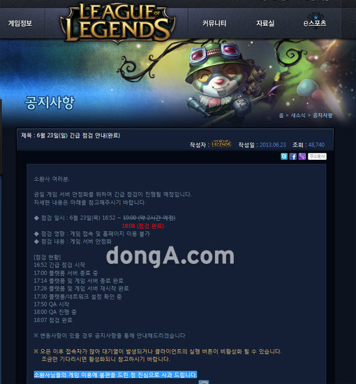롤서버 점검 완료… 게임업체 측 사과에도 유저들 ‘부글부글’
