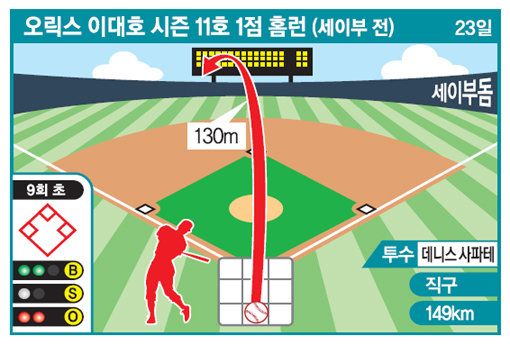 이대호는 23일 일본 사이타마현 도코로자와 세이부돔에서 열린 세이부와의 원정경기에 4번 1루수로 선발 출전해 9회초 시즌 11호 홈런을 터뜨렸다. 홈런이 더욱 짜릿했던 이유는 오릭스가 6-7, 1점차로 뒤지던 9회 2사 후 주자 없는 상황에서 터졌기 때문이다.