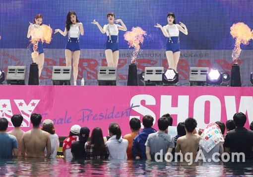 걸그룹 걸스데이가 ‘여자 대통령’으로 돌아왔다. 걸스데이가 24일 오후 서울 중구 반얀트리호텔 야외수영장에서 열린 정규 1집 음반 발매 기념 쇼케이스에서 화려한 공연을 펼치고 있다.
