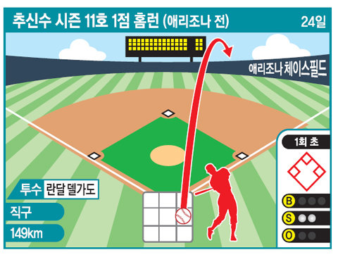 추신수는 24일(한국시간) 체이스필드에서 열린 애리조나와의 원정경기에 1번 중견수로 선발 출장해 시즌 11호 홈런을 포함해 3타수 1안타 2볼넷 1타점 1득점을 기록했다. 홈런은 첫 타석에서 나왔다. 추신수는 1회 첫 타석 볼카운트 0B-2S서 애리조나 우완 선발투수 란달 델가도의 직구(시속 149km)를 받아쳐 선제 결승 우중월솔로아치를 그렸다. 추신수의 시즌 4번째 1회 선두타자 홈런. 리드오프의 홈런으로 상큼하게 출발한 신시내티는 2번 잭 코자트의 2루타와 4번 브랜든 필립스의 좌월2점홈런으로 1회에만 3점을 뽑아 승기를 잡았다.