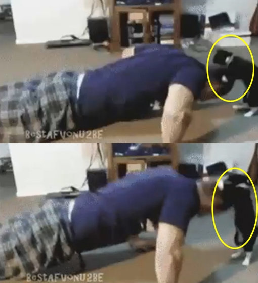 공개된 무서운 헬스 트레이너 영상에는 한 남성이 팔굽혀펴기를 하는 모습이 담겨있다. 그의 머리맡에는 남성을 코치하는 헬스 트레이너의 모습이 보인다.