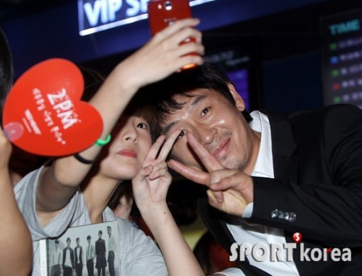 배우 설경구가 25일 오후 서울 코엑스 메가박스에서 열린 영화 ‘감시자들’ VIP 시사회에 참석해 여성 팬과 기념 촬영을 하고 있다.
