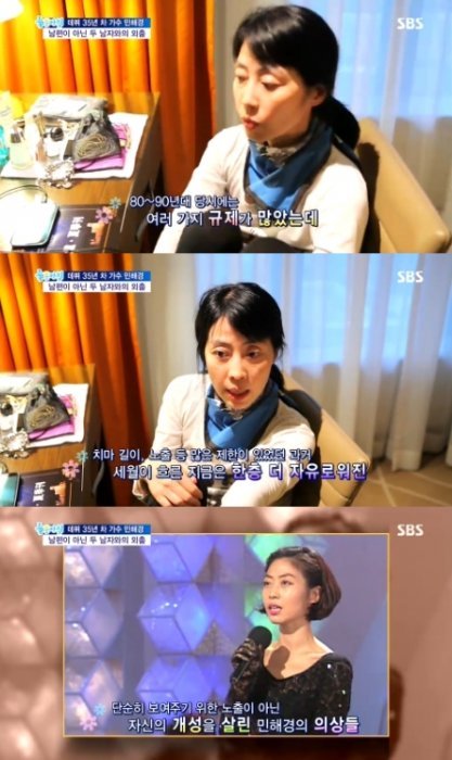 이 어 민해경은 “규제가 심했지만 난 그런 점에서 대담했던 것 같다. 노출을 위해서가 아닌 패션을 생각했었다. 아무도 안 입을 때 시스루 룩도 당당하게 입었다. 지금도 코디 없이 내 의상을 스스로 책임진다. 내 장점, 단점을 가장 잘 알고 있다. 내가 코디하는 게 제일 편하다”고 설명했다.
