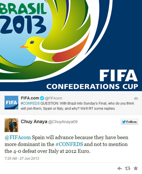 FIFA는 27일 이벤트의 일환으로 트위터를 통해 “브라질의 결승 상대로 스페인과 이탈리아 중 어떤 팀이 올라올 것 같은가? 그 이유는?”이라는 질문을 올렸다.