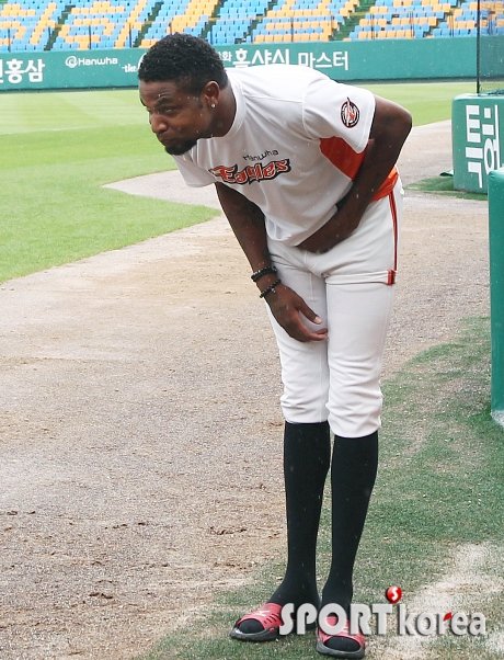 ‘2013 한국야쿠르트 세븐 프로야구’ 한화 이글스와 삼성 라이온즈의 경기가 27일 오후 대전 한밭야구장에서 열린다. 경기전 한화 바티스타가 삼성 이승엽을 보며 90도 인사를 하고 있다.