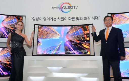 삼성전자가 27일 서울 서초동 사옥에서 기자간담회를 개최하고 55인치 커브드(Curved, 곡선) OLED TV를 출시한다고 밝혔다. 지난 4월 55인치 커브드 OLED TV를 출시한 LG전자에 이어 세계 두 번째다. 커브드 TV란 화면이 평평한 일반 TV와 달리 양 옆이 15도 가량 휘어있는 제품이다. 화면이 커짐에 따라 측면이 눈에 잘 들어오지 않는 문제를 해결했다.