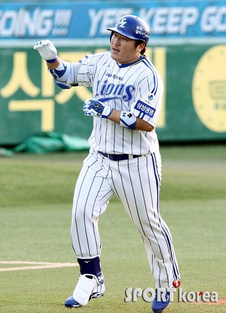 ‘2013 한국야쿠르트 세븐 프로야구’삼성 라이온즈와 KIA 타이거즈의 경기가 28일 오후 대구 시민야구장에서 열렸다. 1회말 2사에서 삼성 최형우가 KIA 선발 양현종을 상대로 동점 솔로홈런을 친 후 그라운드를 돌며 환호하고 있다.