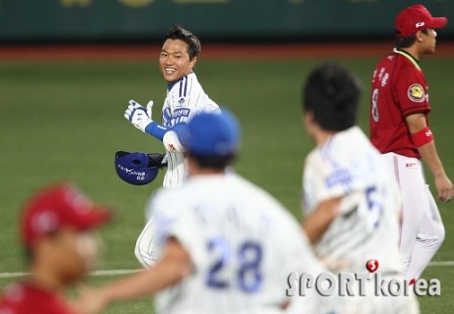 9 회말 2사 1, 3루에서 삼성 정병곤이 짜릿한 끝내기 안타를 친 후 동료선수들의 축하를 받고 있다. 삼성은 1점차로 뒤진 상황에서 1루주자 정형식이 2루 도루를 시도하다 아웃될 뻔 했으나 2루심 이기중 씨의 세이프 선언으로 찬스를 이어갔다. 삼성은 이후 배영섭의 동점 적시타와 정병곤의 끝내기 안타로 짜릿한 승리를 거뒀다.