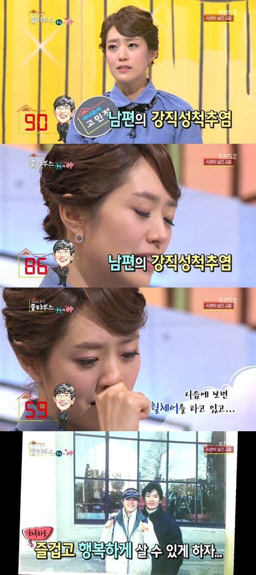 이어 “척추가 굳어지는 벼잉다. 처음 봤을 때 남편이 절룩거리다가 그 다음에는 목발을 잡고 있었다. 또 다음에 가면 휠체어를 타고 있고 그 다음에는 침대에서 못 일어나더라”며 “남편의 모습을 보며 ‘나라도 강해지자. 이 사람을 하루라도 행복하게 살 수 있게 하자’고 마음을 먹었다”고 눈물을 흘렸다.
