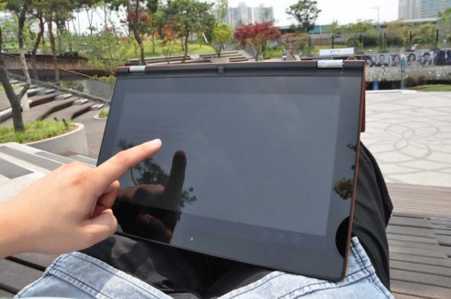화면 크기는 11.6인치이며 해상도는 1,366x768이다. 이는 요즘 출시되는 저전력 노트북의 일반적인 해상도지만, 풀HD를 지원하는 스마트폰이 나오는 것을 보면 조금 아쉽다. 대신 이 제품은 IPS 디스플레이를 탑재했다. 이 덕분에 시야각이 넓고, 야외 시인성이 높으며, 색 표현력도 좋다. 또한, IPS 방식은 다른 LCD 화면보다 터치에 적합한 구조다. 일반 LCD 화면은 화면을 손가락으로 꾹 누르면 해당 부분의 색이 변하고, 원래대로 돌아오는데 시간이 걸린다. 반면, IPS는 세게 눌러도 색이 잘 변하지 않으며, 변하더라도 돌아오는 시간이 짧다.
