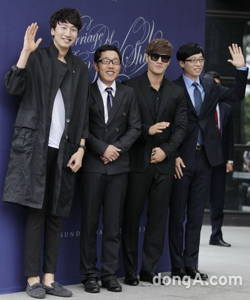 이광수, 김제동, 김종국, 유재석이 차례로 서 있는 모습이다. 사진만으로도 유재석의 비율이 압도적임을 알 수 있다. 모델 출신 이광수가 큰 키를 앞세워 선방하는 모습이다.
