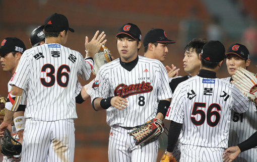 수요일만 되면 우뚝 서는 거인. 롯데 선수들이 3일 사직구장에서 벌어진 선두 삼성과의 홈경기에서 9-2의 완승을 거둔 뒤 마운드에 모여 함께 기뻐하고 있다. 롯데는 올 시즌 수요일 경기에서 10승2패의 초강세를 보이고 있다. 사진제공|스포츠코리아