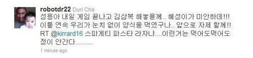 이에 차두리는 “이틀 연속 눈치 없이 양식을 먹였구나… 앞으로 자제 할게!”라고 사과했다. 누리꾼들은 “본인을 생각해준 차두리에게 너무한 것 아니냐”는 반응을 보였다.