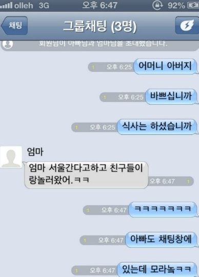 공개된 '엄마의 당당한 답장'사진은 가족의 단체 채팅창을 캡처한 것이다.