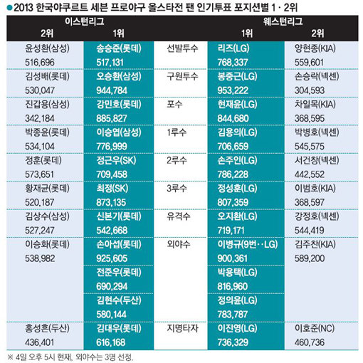 ‘2013 한국야쿠르트 세븐 프로야구 올스타전’이 19일 포항구장에서 열린다. ‘별들의 잔치’ 올스타전은 말 그대로 리그를 대표하는 스타플레이어들이 한 구장에 모여 실력을 뽐내는 무대다. 그러나 지난해 롯데에 이어 올해 LG가 전 포지션을 독식하면서 올스타 팬 인기투표 방식에 대한 논란이 재현되고 있다. 팬 투표의 특성상 어쩔 수 없이 받아들여야 한다는 의견도 있지만, 개선책을 찾아야 하는 것 아니냐는 목소리도 적잖다.