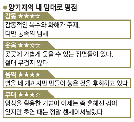 원작이야 물론 훌륭하겠지만 한국관객의 마음에 콕콕 박히게 우리말 가사로 옮긴 박인선 연출가의 솜씨도 대단하다.