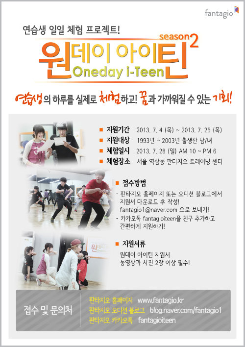 한편 판타지오의 ‘원데이 아이틴 시즌2’는 오는 7월 25일까지 판타지오 홈페이지 및 오디션 블로그를 통해 지원가능하며 카카오톡(fantagioiteen)으로도 지원할 수 있다. 선발된 인원은 오는 7월 28일 판타지오 역삼동 트레이닝센터에서 ‘원데이 아이틴’에 참여할 수 있는 기회가 주어진다.