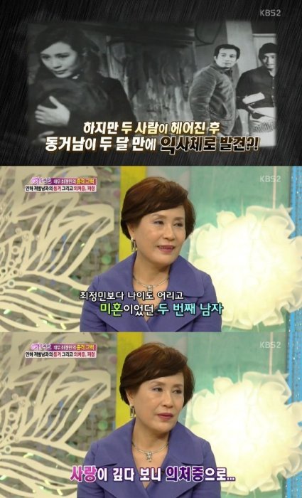최정민은 “집안끼리 가까운 4살 연하의 재벌회장이었다. 내 모든 아픔을 해결해줬다. 배우 활동도 적극 지원했다”며 전 남편과는 달랐던 그를 회상했다.