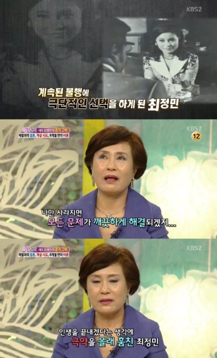 5일 방송된 KBS2‘여유만만’에서는 70년대 스크린의 여왕 최정민이 출연해 힘든 과거 때문에 자살시도까지 했다고 고백했다.