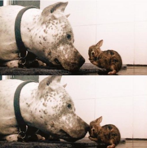 영상에는 덩치가 큰 개가 작고 귀여운 토끼를 하염없이 바라보고 있다. 앞발로 자신의 얼굴을 비비며 장난을 치는 토끼의 모습을 가만히 바라보다 혀로 토끼의 얼굴을 핥는 모습이 귀엽다.