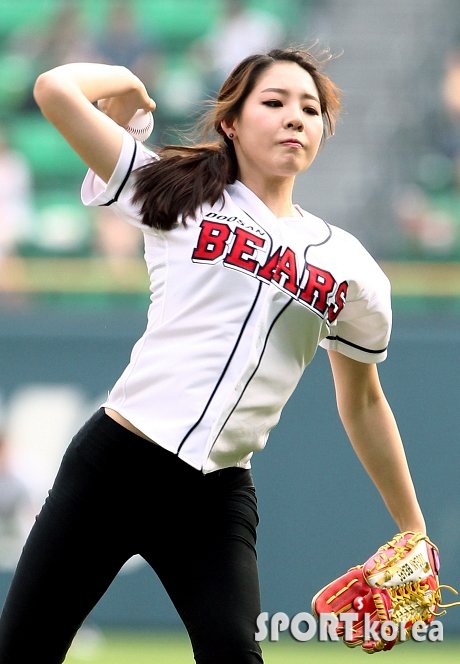 신수지가 환상적인 시구를 선보였다. ‘2013 한국야쿠르트 세븐 프로야구’ 두산 베어스와 삼성 라이온즈의 경기가 5일 오후 서울 잠실야구장에서 열렸다. 경기전 전 리듬체조선수 신수지가 멋진 시구를 선보이고 있다.