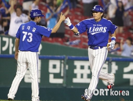 ‘2013 한국야쿠르트 세븐 프로야구’두산 베어스와 삼성 라이온즈의 경기가 5일 오후 서울 잠실야구장에서 열렸다. 8회초 2사 만루에서 이승엽이 두산 이정호를 상대로 만루홈런을 친 후 그라운드를 돌며 김재걸 3루코치의 환영을 받고 있다.