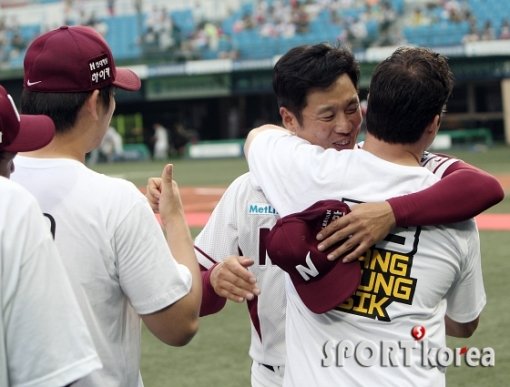 ‘2013 한국야쿠르트 세븐 프로야구’ 넥센히어로즈와 LG트윈스의 경기에 앞서 강병식 은퇴식이 7일 오후 서울 목동야구장에서 열렸다. 강병식이 은퇴식을 마친 후 넥센 선수들과 포옹을 나누고 있다.