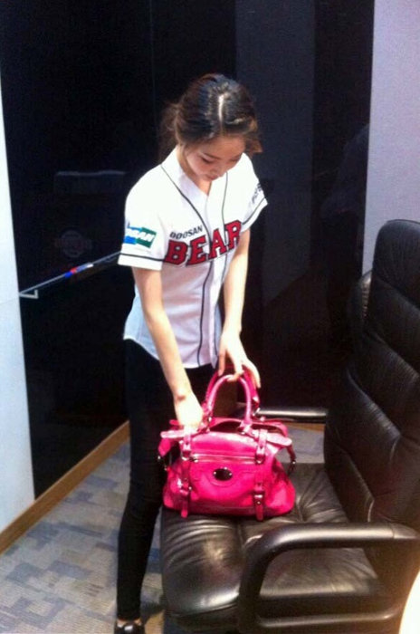 신수지는 과감했던 시구동작과는 달리 얌전한 모습이다. 그는 두산 상의 유니폼에 검은 레깅스를 매치한 깔끔한 차림으로 가방에서 무언가를 찾고 있다.
