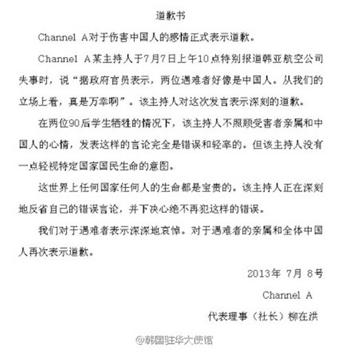 채널A 측이 아시아나 항공기 사고에 “사망자 2명이 모두 중국인이다. 우리 입장에서 다행”이라는 멘트에 대한 사과문을 게재했다.