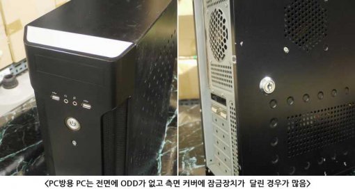 외형으로도 PC방 PC는 특징이 있습니다. 일단 요즘 PC방에서는 CD나 DVD를 쓸 일이 거의 없기 때문에 본체 단가를 낮추기 위해 ODD(광디스크드라이브)가 없는 PC를 쓰는 경우가 많습니다. 그리고 내부 부품의 도난을 방지하기 위해 열쇠 없이는 커버를 열 수 없는 케이스를 쓰는 경우도 많지요. PC케이스 제조사에서는 이런 PC방용 PC를 위한 전용 케이스도 팔고 있습니다. 그리고 무엇보다도 PC방에서 쓰던 PC는 담배냄새가 심하게 납니다. 전원이 꺼져 있을 때는 몰라도 켜보면 단박에 알 수가 있지요.