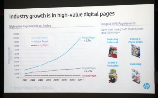 그는 “디지털 프린팅 방식으로 인쇄한 페이지 수가 점점 늘고 있는데, 그 중에서도 HP 인디고로 인쇄한 페이지는 더욱 큰 폭으로 늘고 있다”고 강조했다. 이어 HP 인디고 시리즈 신제품 ‘HP 인디고 10000 디지털 프레스(이하 인디고 10000)’를 소개했다.